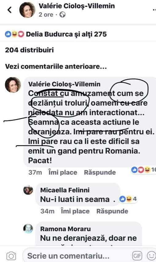 Ulterior aceasta a şters postarea din cauza sutelor de comentarii şi mesaje mai puţin plăcute. Probabil, supărată şi iritată pentru că nu a fost apreciată intenţia ei, Valerie a postat un comentariu plin de greşeli gramaticale.