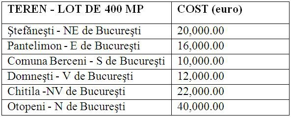 Având în vedere că preţurile terenurilor în Bucureşti sunt prohibitive pentru majoritatea celor care doresc să îşi construiască o casă, cererea se mută către localităţile din judeţul Ilfov. Unele dintre cele mai căutate zone sunt Ștefăneşti, Pantelimon, Berceni, Domneşti, Chitila sau Otopeni. Preţul pe mp diferă în funcţie de localizare şi proximitatea faţă de mijloacele de transport în comun şi prezenţa utilităţilor. Am luat în considerare preţurile medii pentru loturi de 400 mp.