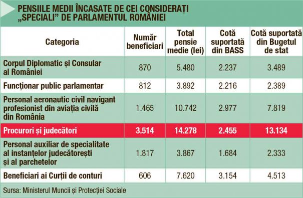 Cele mai mari pensii din ţară le au procurorii şi judecătorii. Aceasta se calcluează diferit faţă de un angajat normal, adică nu pe baza contribuţiilor sociale, ceea ce determină în mod cert dezechilibre şi inechităţi greu de explicat. Pensia medie a unui judecător sau procuror este de 13.134, conform datelor furnizate de Ministerul Muncii la solicitarea Capital.
