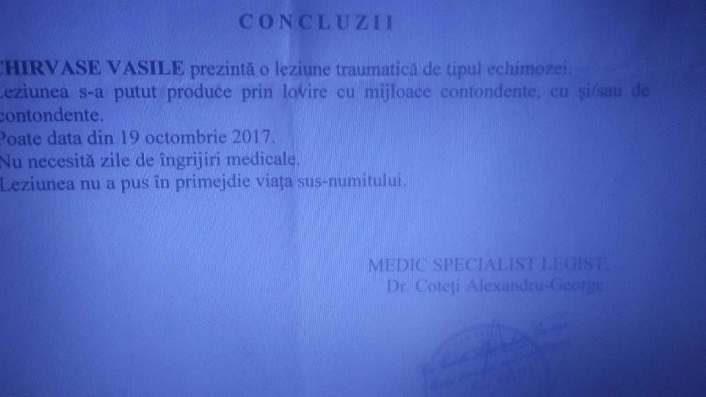 Astfel eu m-am deplasat la Serviciul de Medicina Legala Vaslui unde mi s-a eliberat un astfel de certificat. Precizez ca simteam dureri foarte mari in zona cervicala si a capului.