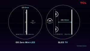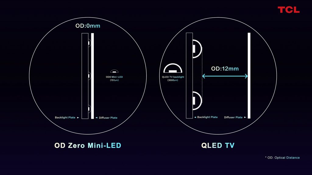 Tehnologia OD Zero combină ultima generație de backlight Mini-LED de la TCL cu un design impresionant realizat printr-o integrare verticală de efect, ultra-slim, ajungând la un produs finit cu un standard care nu a mai fost niciodată realizat la televizoare LED-LCD.  În termeni mai simpli, OD Zero reprezintă distanța optică dintre stratul Mini-LED backlight și stratul ecranului LCD (placă-difuzor), care, datorită investițiilor, cercetării și determinării TCL, a fost redus acum la 0 mm, oferind un modul backlight ultra-subțire și de o calitate excepțională. Astfel, prin luminozitatea impresionantă, culorile pline, bogate, extraordinar de bine definite, contrastul precis și uniformitatea excepțională, OD Zero depășește tehnologia anterioară Mini-LED TCL.