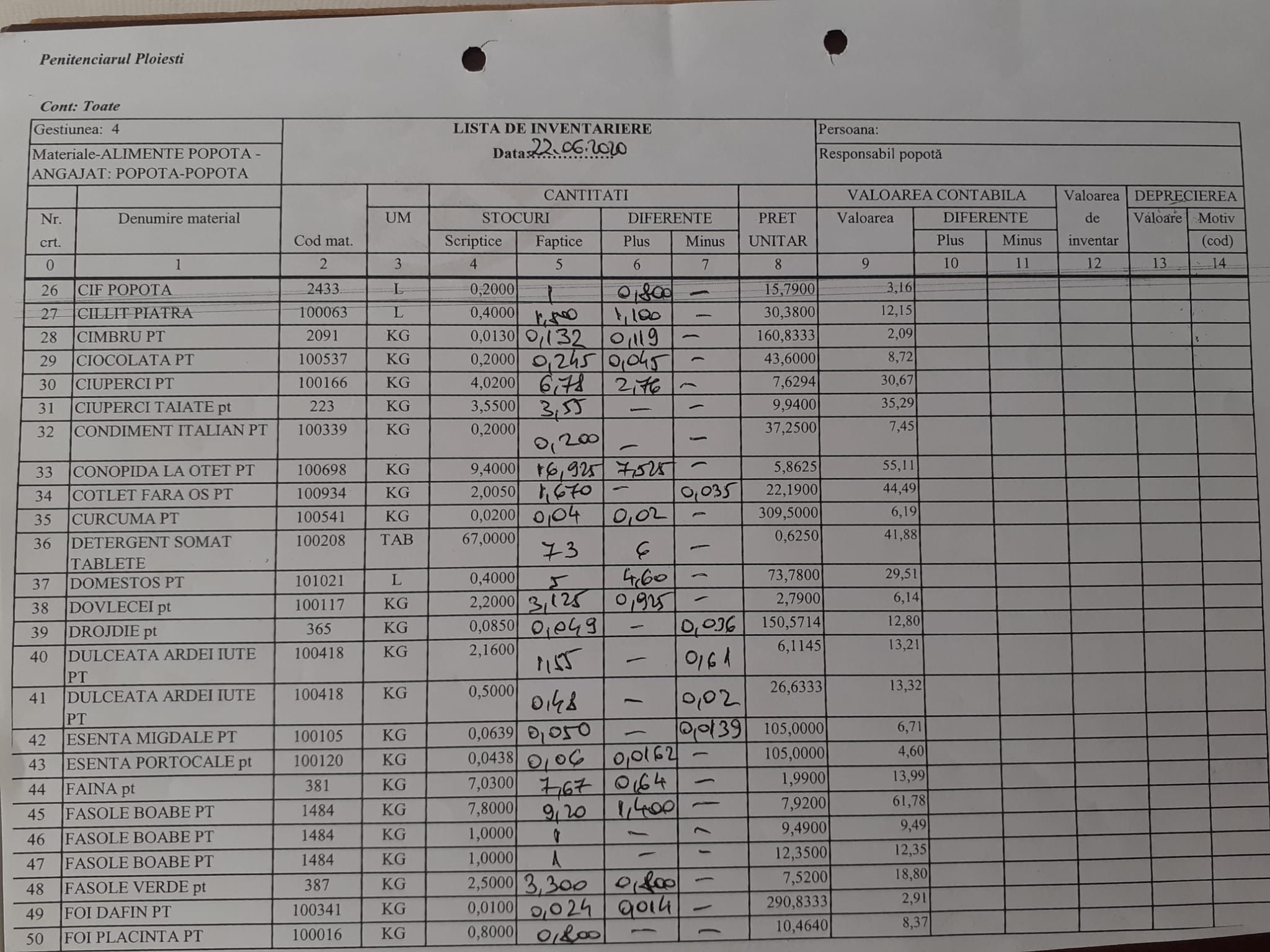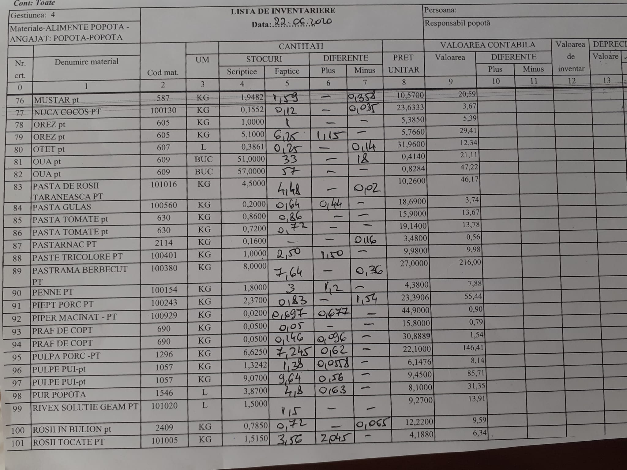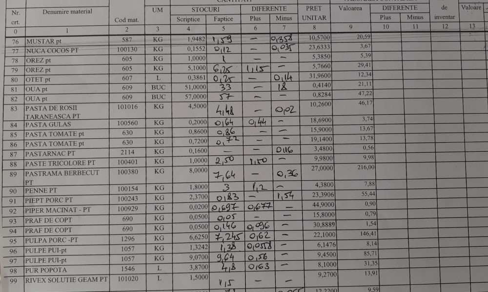 Din Listele de inventariere –Alimente au reieșit aproape la fiecare sortiment diferențe. De ce nu s-a luat nici o măsură???? Alimentele sunt achiziționate din fondul de rulment, banii oamenilor.