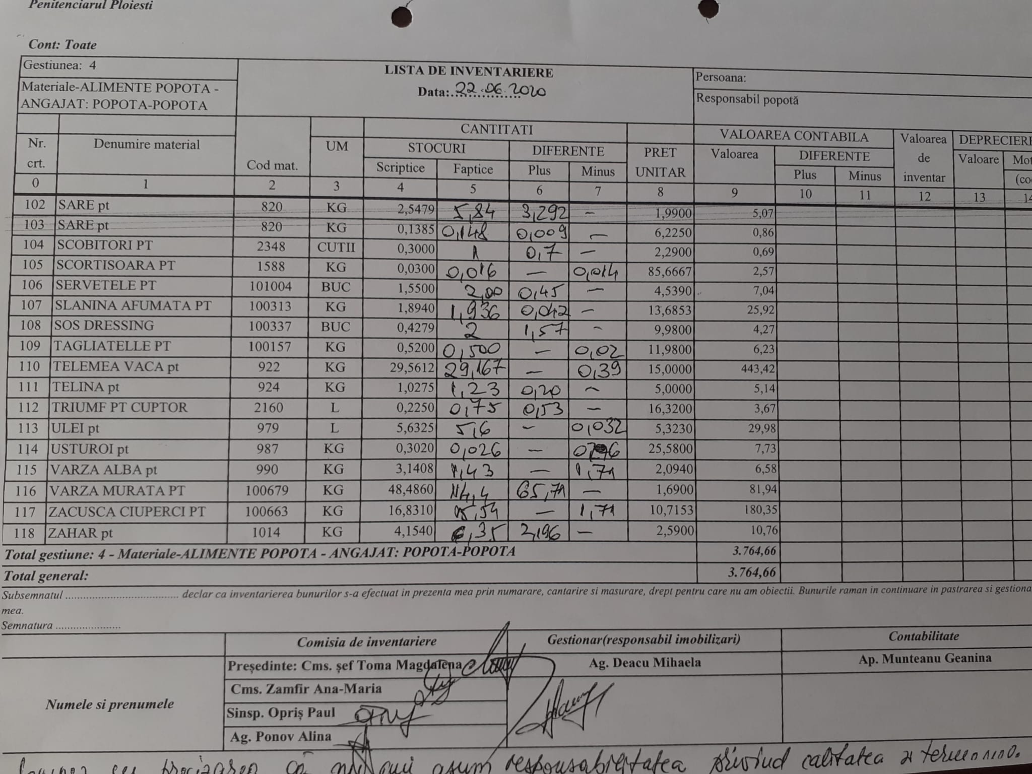 În data de 22.06.2020 în Listele de inventar la  nr. crt. 22 ,onor Maica Stareță și Alaiul ei Comisia,  au înregistrat ,, cică” 21 farfurii în coloana denumită Stoc Faptic, adică găsite întregi în popotă.