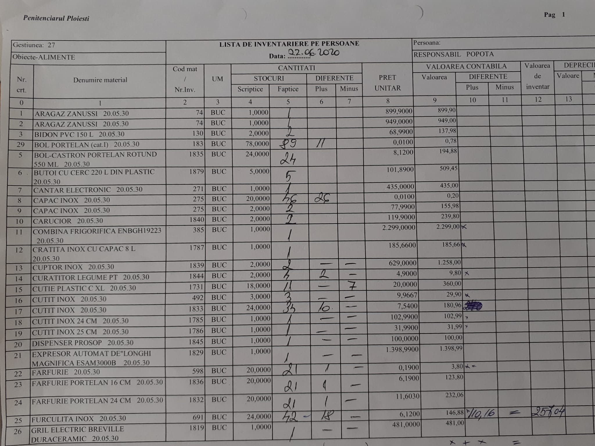 1. La inventarierea lui Polifrone , acesta vine cu alte Liste de inventariere privind gestiunea Popotă din contabilitate , respectiv Gestiunea 27 Alimente –responsabil Popotă. Pe aceste liste ,,Logic” nu se găsește serviciul de masă de 119,90 lei!!!