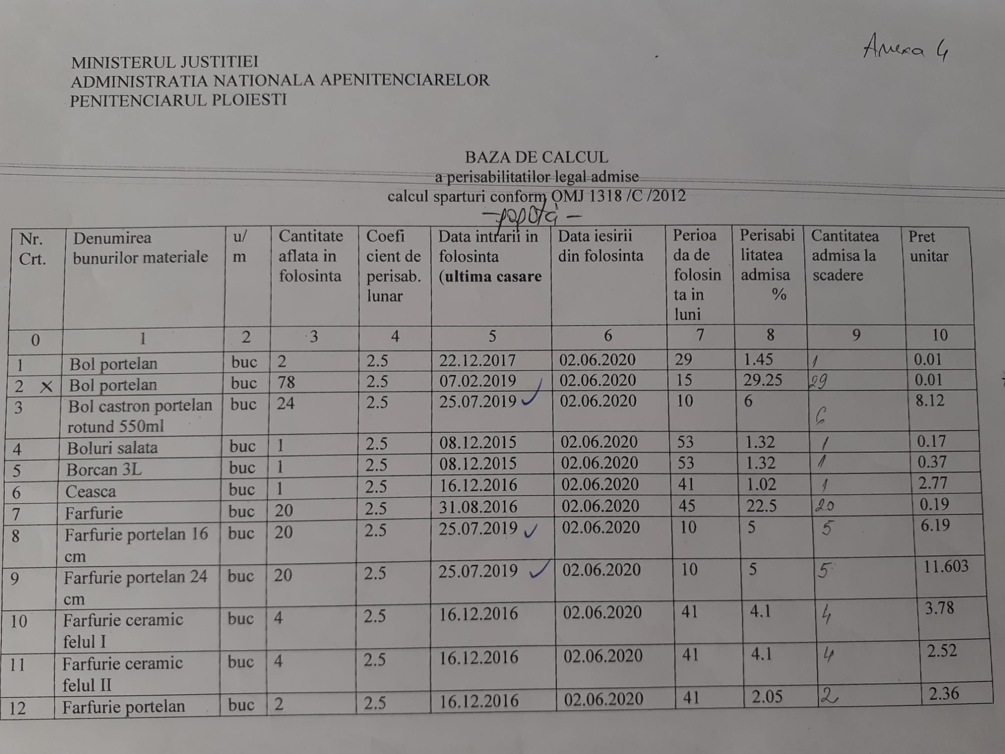 Se întocmește un tabel ,, BAZA DE CALCUL a perisabilităților legal admise , calcul spărturi conform OMJ 1318/C/2012” întocmit de Logistică și semnat  de Regină.